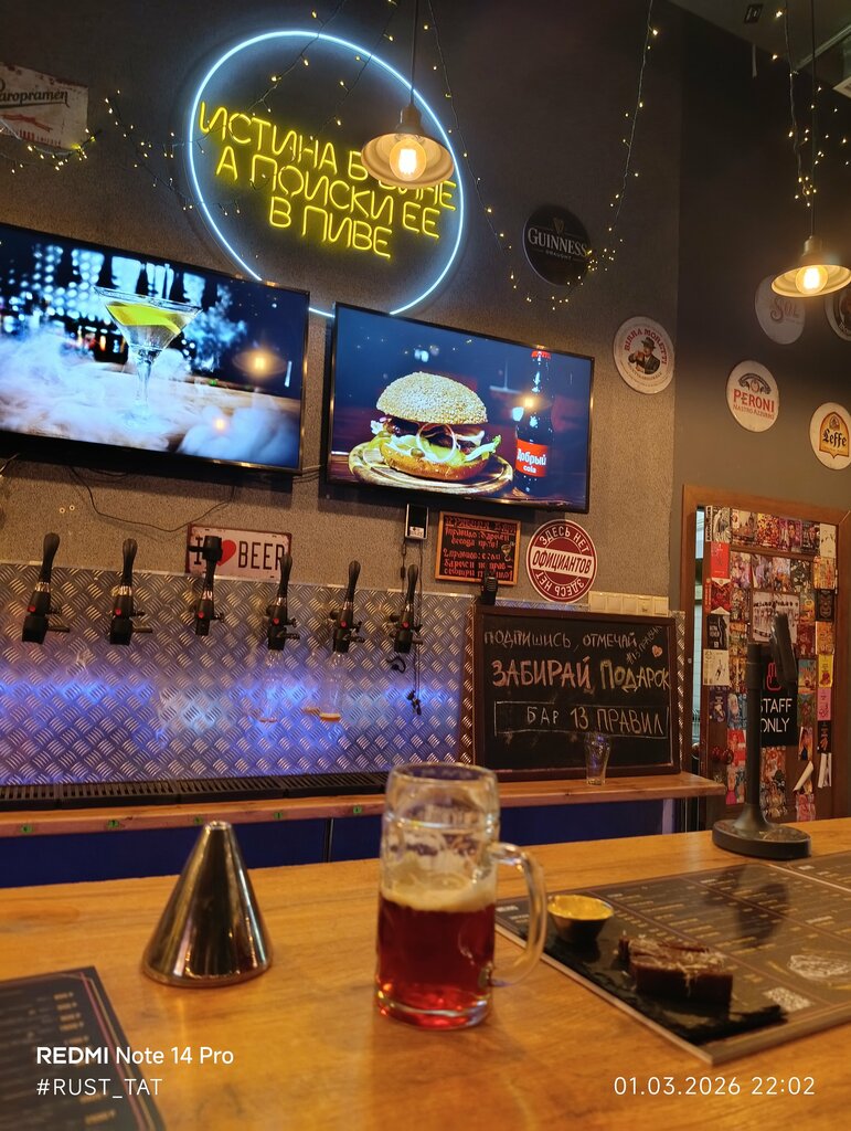 Отличный бар. Есть пиво на кранах, крафт в холодильнике, коктейли делают и отличная кухня с закусками и фастфудом. Круто когда устраивают тусовки – фул посадка