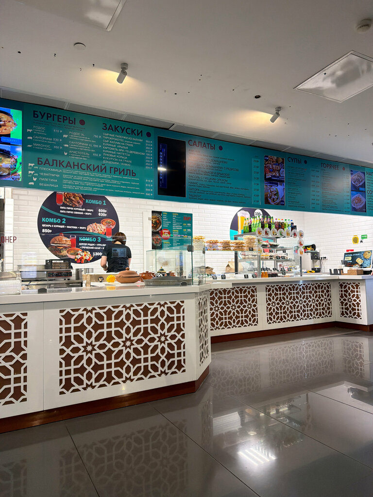 К сожалению никаких плюсов( Были проездом в тц, зашли поесть, очень заинтересовала эта точка. Заказали гирос с курицей и бургер с дополнительным сыром халлуми. Гирос обещали приготовить за 5 минут, а бургер за 15, в итоге ждали оба блюда более 25 минут. Гирос по размеру и весу оказался намного больше бургера, при том что в цене бургер дороже на 200 рублей. Гирос пресный, соуса и соли не было вообще, курица сухая и не промаринованная, было настолько сухо, что глотать тяжело и больно. Бургер размера с канапе, когда муж откусил, стало понятно что сыр халлуми не положили. Персонал не приветливый, я спросила почему не положили сыр, мне предложили переделать бургер с нуля, тоесть еще ожидать 25 минут ради посредственного бургера? Мы итак опаздывали уже, и ожидать отказались, благо деньги вернули. Идея хорошая, исполнение плохое по всем фронтам(