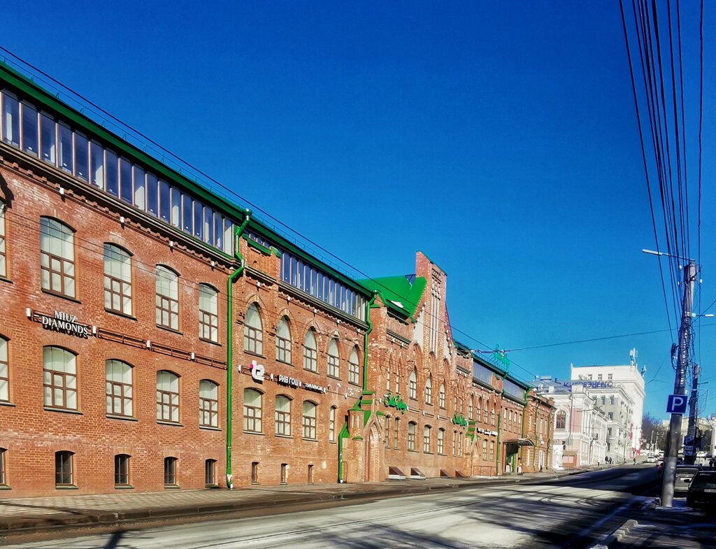 Здание мастерских построено по проекту архитектора Горбунова в 1920 в стиле неоготика. Стрельчатые окна, двери и другие сложные архитектурные элементы на современный взгляд кажутся какими-то диковинками, ведь строились всего лишь мастерские. Сейчас для мастерских построили бы прямоугольный ангар. Фасад сделан из местного красного кирпича со светлыми вставками из опоки для контраста и красоты. Опять же – для здания мастерских. В советское время мастерские стали называться завод «Физприбор». В 90-е завод закрыли и удивительно, что не снесли, учитывая что находится он в центре города. Сейчас здесь ТЦ. Фасад здания сохранился в первоначальном виде, если не считать современных вывесок.