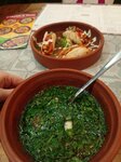 Густой пряный суп на основе говяжьего бульона и томата с отварной говядиной, рисом, грецкими орехами, чесноком, свежей зеленью и ароматными специями.