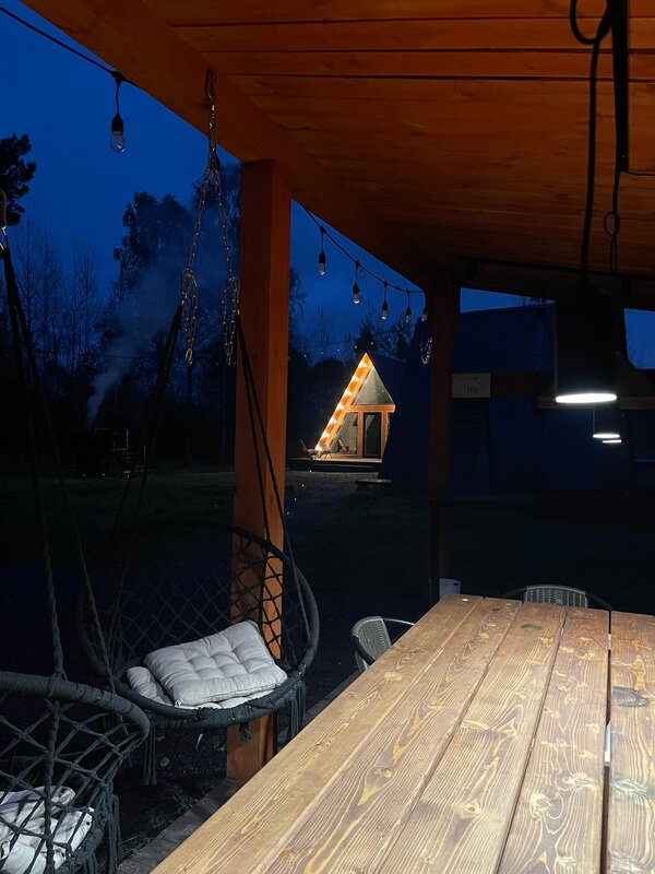 Thank you very much!🩵 Today we visited this cozy Aframe-style house and were very satisfied! The house itself is made with love and attention to detail — it's cozy, warm and comfortable inside. The sauna was a real pleasure: the steam was intense, and afterward there was a pleasant feeling of relaxation. The tub with foam and petals became a great place to relax outdoors, especially in the evening, the rain was not a hindrance) The gazebo with swings created an atmosphere of comfort and tranquility — ideal for relaxing in company. The atmosphere here is very pleasant: quiet, beautiful, bird sounds, saturated with nature. The whole complex creates a feeling of harmony and comfort, which allows you to completely relax and forget about the hustle and bustle of the city. The service was attentive and friendly, and the conditions were as comfortable as possible. We recommend it to everyone who is looking for a place to relax in nature with a homely atmosphere and a good atmosphere! Minus: gadflies (severe swelling) and mosquitoes. We recommend purchasing a magnetic screen for the front door.