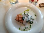 Форель с укропным пармантье и зеленым горошком