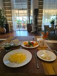 Уютный отель, расположен у порта. До пляжа,кафе и ресторанов пешком идти прилично. До пляжа с утра и до 19.15 курсирует автобус. В номере есть все необходимое (чайная станция, халаты, тапочки, утюг, гладильная доска и сушилка, на балконе оборудована зона отдыха). В номере также достаточно зон для отдыха,есть и кресло и софа. Все расходники пополняют ежедневно. Завтраки нормальные, есть горячие и холодные блюда,фрукты и десерты, в т.ч. полезные, блюда из яиц готовят по заказу. Также в отеле есть открытый и крытый бассейн, джакузи и сауна. Единственное пожелание: организовать более оперативную уборку столов после завтрака,бывало,что приходилось ждать когда уберут посуду при полной загрузке зала.