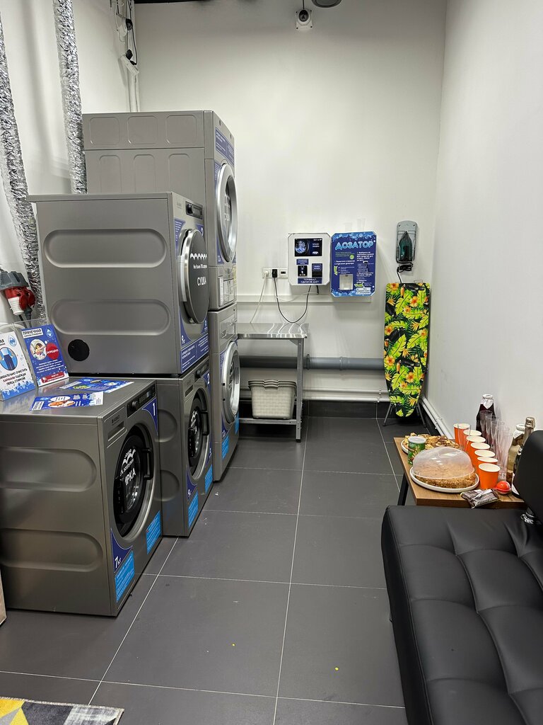 три стиральные машины (12,9,7 кг) и две сушильные (12,9 кг). Удобно, рядом парковка. Приехала к четырем, никого не было, заняла сразу три машины. И следующий клиент пришел стирать, как раз когда я заканчивала сушить. Не было только моющих средств в автомате, но в этом же здании Пятерочка, так что купить тут же моющее средство и кондиционер не проблема. Оплата и картой, и наличными. Там же есть и утюг и гладильная доска, если кому-то надо. Чисто
