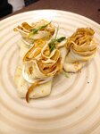 Фирменные блинчики с начинкой из куриного филе, свежего помидора и огурца в сливочно-чесночном соусе с сыром пармезан