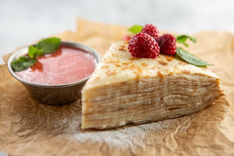 Блинный сет из 12 блинов с топпингами: мёд, варенье клубничное и вишневое, сметана, масло, сгущенное молоко