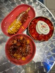 Хрустящие кусочки куриного филе, покрытые глазурью из кисло-сладкого, сладко-острого и сырного снега, салат коул-слоу и соус на выбор. Половина порции