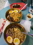Рис с говядиной, овощами, древесными грибами, яйцом и белым кунжутом. Подаётся с острым соусом и горячим бульоном