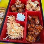 Хрустящие кусочки куриного филе, покрытые глазурью из кисло-сладкого, сладко-острого и сырного снега, салат коул-слоу и соус на выбор
