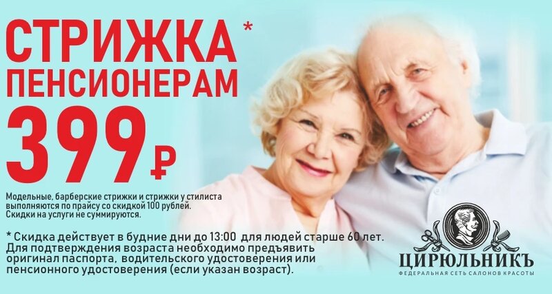 СТРИЖКА ДЛЯ ПЕНСИОНЕРОВ 399 рублей На модельные, барберские и стрижки у стилистов предоставляется скидка 100 рублей. Скидка действуют до 13:...