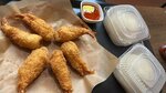 Рис жаренный на воке, с креветками, кальмарами, яйцом, кукурузой, горохом, морковью и зеленым луком. Посыпается луком фри.