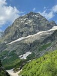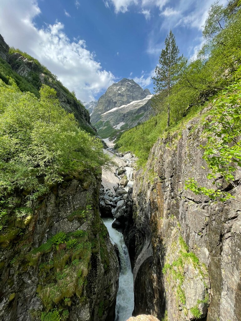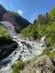 Полноценным водопадом назвать Чертову мельницу можно с натягом, мне показалось, что это водоворот, который бурлит в каменной теснине ущелья. Небольшой, но шума создает много… Отсюда, с камня, под которой гудит Чертова мельница, открывается живописный вид на ущелье Аманауз, ледник и Суфруджинские водопады. Для тех кто боится высоты, подходить к краю камня не рекомендую, от круговерти Мельницы кружится голова. Маршрут не сложный, отличная дорога для знакомства с Домбаем. Но место сезонное, до таяния ледников сюда не пускают - риск схода лавин. 🏃‍♂️: 1 км. до водопада Чертова мельница (примерно 20 минут.) 💰: 300p. с человека у КПП ⛺️: Маршрут легкий. Основную сложность вызывает некоторый резкий перепад высот и переходы по самодельным лестницам в ручьях