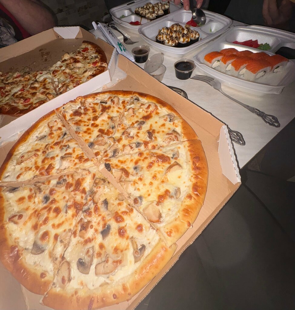 Огромное спасибо за вкусный ужин! Заказывала пиццу с ветчиной и грибами и сет роллов — всё просто идеально. Атмосфера в кафе уютная, персонал приветливый. Очень довольны, будем заходить почаще!