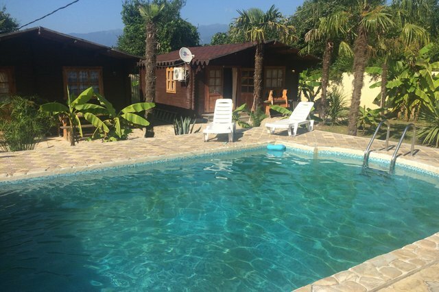 There is no pool, which is shown in the photo. There is no playground for children, there is only one slide. The showers in the rooms are in terrible condition, sand is everywhere, it is clear that no one is cleaning! Two of the 4 days lived there, because of an inadequate man like a watchman. There is no administrator there, we forgot the keys on the beach in Gagra, from our neighbor, and we begged the keys from this guard with a fight! I do not recommend it, this place can greatly spoil your mood on vacation.