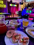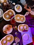 Бар «Евгенич» уже у многих на слуху. И тот факт, что пик популярности на атмосферу и атрибутику 90х был несколько лет назад и сейчас как бы слегка идет на нет, не уменьшает поток гостей в этот тематический бар. Концепт понятный: лицо заведения «Евгенич» из одноименно сериала, он же Сергей Жуков из «Руки вверх». Внутри все как в «пацанских» народных 90х: аскетичная мебель, ковры на стенах и на полу, множество плакатов на стенах и потолке с кумирами тех времен, кассетники, на плоских экранах транслируется вид ретро телевизоров, неон, диско шары и в зале звучит знакомая попсятина, которая была слышна «из каждого утюга». Персонал в спортивках, оч лаконично сливается в атмосферу. Кстати, вспомнила, что в «баре Бибирево» тоже официанты в спортивных костюмах ходят, и там тоже ироничная отсылка, но там «богатый» вайб и костюмы видно, что сшиты а-ля, а тут такое ощущение, что их и купили еще в 90х. И попадаешь в этот ретро портал через расписанный по всем канонам 90х подъезд, тож прикольно. Мы были в баре на Пятницкой, и это как портал в прошлое посреди центра Москвы. Миллениалам все это понятно и знакомо, и, конечно, вызывает ностальгию. Сначала немножко впадаешь в ступор, но быстро вливаешься. Персонал дружелюбный, посуда чистая, меню реально «чисто на приколе», сюда приходят «прибухнуть интеллигентно». Напитки со всеми «вкусами из детства»: настойки чупа-чупс, барбариски, индийский чай, пломбир; коктейли тоже прям самобытные, чего в них не намешано, но, как не странно звучит, реально такое раньше пили. Есть и пиво, и крепкие напитки, и вина, все, конечно, российское. Ценник на все оч демократичный. Особенно выгодно приходить большой пьющей компанией. По еде, а точнее сказать, по закускам. Ну очевидно, тут не ждешь чего-то высокого и авторского. Тут еда, как с обычно кухни 90х: борщ, бутеры, макары с котлеткой, пельмени, и, конечно, чебуреки. Мы были 8 марта и чебуреки были в форме восьмерок, забавно и тематически. Вечерами тут караоке, песни пляски, можно заказывать свою музыку, ну в общем в лучших традициях тех времен. Забавно было, что и публика прям как из прошлого! Переступая порог бара и попала я в этот интерьер гости как-то даже внутренне менялись и оч гармонично вливались в интерьер. Знаете, после посещения у меня осталось какое-то послевкусие «доброй ностальгии», вот реально мы же прошли такое, и оказались в той точке, в которой живем сейчас. Для кого-то этот бар как из ретро сериалов, а для кого-то как из домашнего фотоальбома, и каждый приходит за своим, и кайфует по-своему. Секрет популярности «Евгенича», как секрет группы «Руки вверх», не понятный, но очень интересный!