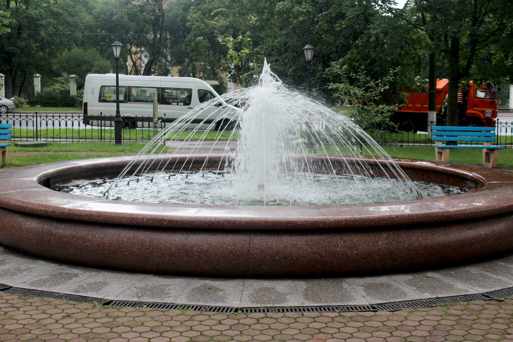 Один из фонтанов находится в Кронштадте напротив Водонапорной башни. Вокруг фонтана установлены деревянные скамейки для отдыха. Не проходите мимо и передохните после прогулки по городу...