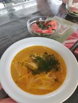Начну с того, как туда попасть. С трассы кафе не видно. Нужно объехать столовую Кукуруза. Мы заказали суп гороховый, жаркое, чай и компот. Цена и объём блюда приятно удивили. Всего 500₽. Суп огромная порция. Почти тазик. Так что если берете и первое, и второе, то лучше брать первого половинку. По вкусу очень даже. Одни плюсы. Туалет чистый, рядом есть душ и прачечная. Очень удобно. Парковка большая. В общем, рекомендую 👍