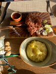 Ресторан понравился больше всех на территории отеля. Вкусно, атмосферно, красивая подача, вежливый персонал. Дорого. Единственный минус в штруделе вишневом попались две косточки. Но я даже не снижаю за это звезду, так как уверена, что везде где встречается вишня, попадаются косточки. Просто не рекомендую его брать. Очень вкусный квас, стейки, картофель на углях.