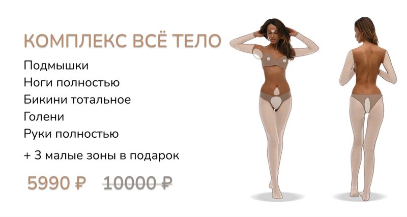 Всё тело 5990 вместо 10000. Подмышки, бикини, ноги, руки, 3 малые зоны