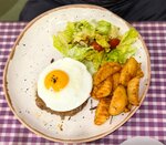 классическая глазунья из 2-х яиц, обжаренные сосиски, салатный микс со свежим томатом и зеленым горошком, заправленный соусом Тартар, пшеничный тост, кетчуп