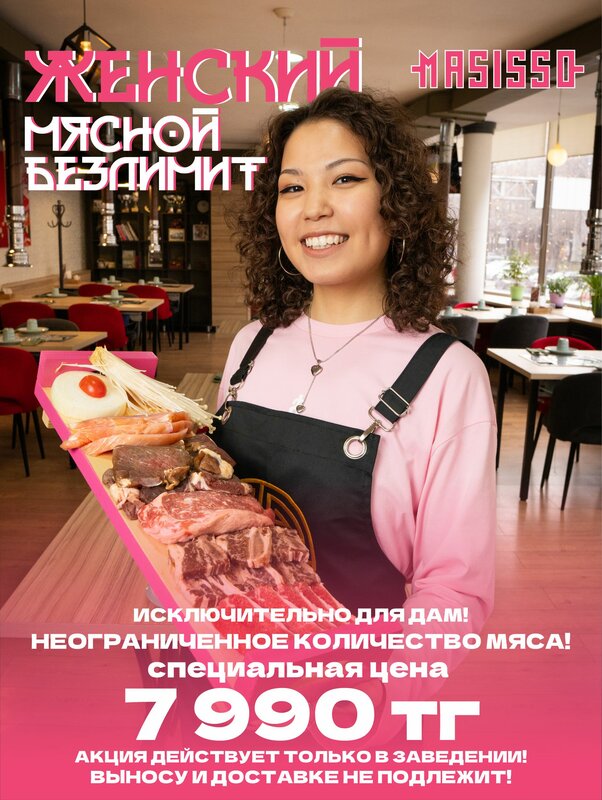 🩷 Весенняя акция для прекрасных дам! Весь март во всех филиалах Masisso — 💃 Женский Мясной Безлимит всего за 7 990 тг на персону! 🥩 Ешьт...