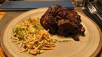 Стейк из секретного отруба в фирменном маринаде, с запечённым чесноком и обожжённым томатом черри.