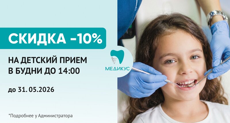 Скидка -10% на детский приём в будни до 14:00: Акция в Стоматологии Медикус в Дзержинске - забота о детской улыбке Если Вы ищете, где получ...