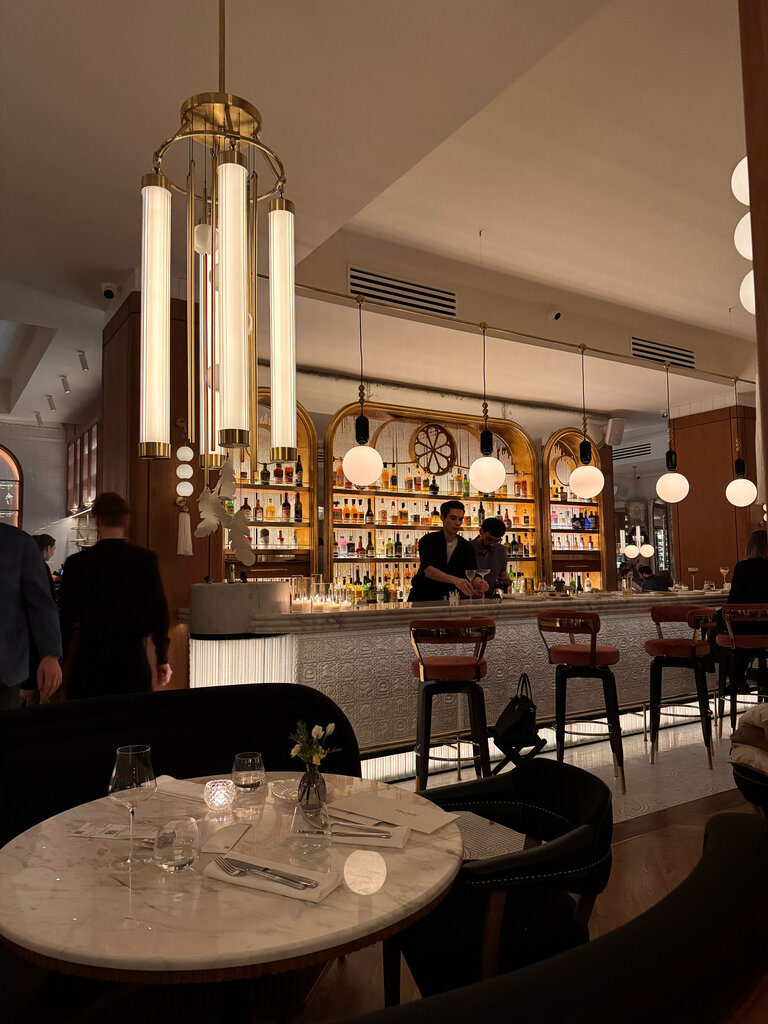 Этот ресторан с кинотеатром и пиано-баром от команды «Счастье» открылся в мае 2025 года напротив Исаакиевского собора, на месте кинотеатра «Англетер». Пишут, что вдохновением для интерьера послужил фильм Вуди Аллена «Полночь в Париже», а Michèle - женский образ ангела добра и вдохновения, который родился благодаря фильмам «Небо над Берлином» и «Ангел-А» Вима Вендерса и Люка Бессона, в связи с чем, видимо, мне стоит пересмотреть все три фильма, потому что кроме одинокой гипсовой фигуры, встречающей гостей заведения, других параллелей не нахожу. Фигура человека с крыльями, кстати, мне не нравится, прежде всего исполнением и материалом. А ресторан хорош! Бренд-шеф ресторана - Олег Азимов, шеф ферментации Николай Березин. И если вас смущает слово «ферментация», не берите в голову, вы с ней знакомы с детства, к примеру, квас, кефир, квашеная капуста - тоже продукты ферментации, которых в меню не было, а что было, давайте посмотрим! Итак, что в тарелке? Моти с крабом и солеными лимонами 850₽ Камчатский краб, творожный сыр и соленые лимоны. Когда заказывала эту холодную закуску, наивно предполагала, что моти будет два. Так же предполагала, что творожный сыр - это Cremette. Ну и вкус в названии читался и считывался, поэтому сомневалась, брать или не брать, с блюдом всё было понятно. С другой стороны, квашеные (соленые) лимоны с крабовым мясом в традиционном японском рисовом тесте я никогда не пробовала, заказала. Самый долгий этап в приготовлении этого блюда - ферментация лимона, остальное - минутное дело, поэтому я искренне удивилась подаче - аскетично до одинокой слезы (маття и цветочек). В таких-то хоромах! Но идея блюда мне нравится. Лимоны претерпели изменения, вкус стал ярче, но чище и мягче. Краба мало, творожный сыр в каждом третьем ресторанном блюде, честно говоря, поднадоел, понимаю, что в современных ритмах он здорово выручает своей универсальность и способностью гармонично зафиналить любое блюдо, но считаю, что так же, как и в истории с азиатскими соусами, он уводит даже самую гениальную гастрономическую идею в сторону street food. Именно поэтому второй раз это блюдо не заказала бы никогда. Но тем гостям Michèle, которые едят в ресторанах нечасто, блюдо стоит попробовать. Мини эклеры с анчоусами, томатами и страчателлой 650₽ Мини эклеры разрезали пополам, добавили небольшое количество сливочного масла, страчателлу, маринованный лук, свежие узбекские томаты и анчоусы, которые, к слову сказать, тоже проходят длительный процесс ферментации белков - от полугода до года. Украсили микрозеленью. Эклеры с анчоусами и томатами я тоже ещё не ела и это тот самый вкус умами, пробуждающий вкусовые рецепторы и стимулирующий области мозга, отвечающие за получение удовольствия. Современные повара сознательно комбинируют продукты, богатые умами (научно признанный пятый базовый вкус), например, томаты (глутамат) и анчоусы (опять глутамат), чтобы в финале блюда имели яркий, глубокий и насыщенный вкус без лишних улучшителей. Что касается эклеров, то всё получилось так, как планировал шеф - умамно, но эклеры, на мой вкус, уж больно темны, я люблю живее цветом. Аргентинская креветка с ремулад-сметаной и томатами 1100₽ Креветки обжарили до появления румяной корочки, уложили на ремулад-сметану (соус на основе фермерской сметаны с добавлением домашнего майонеза) вокруг центра из марин