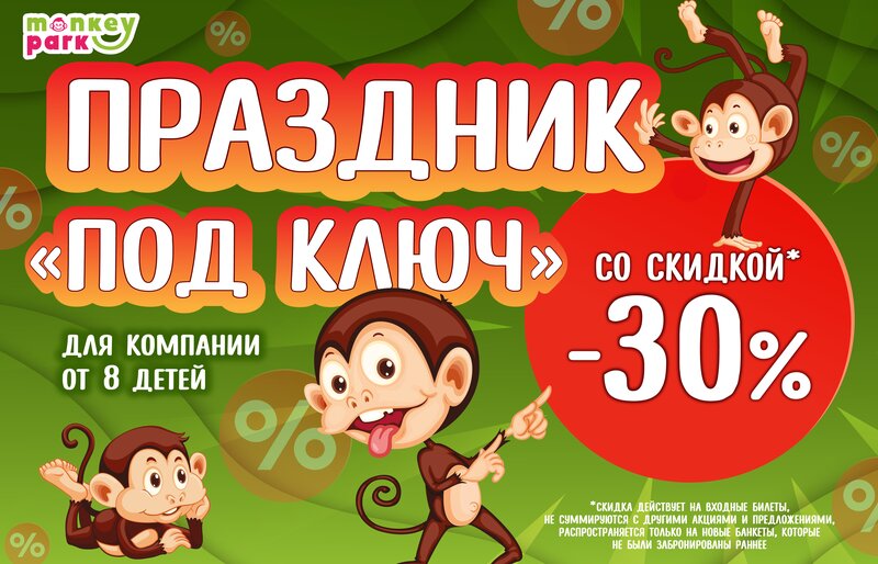 Праздник больше - платите меньше! Дарим скидку -30% на организацию банкета в Monkey Park! Мы знаем, что лучшие праздники случаются в бол...