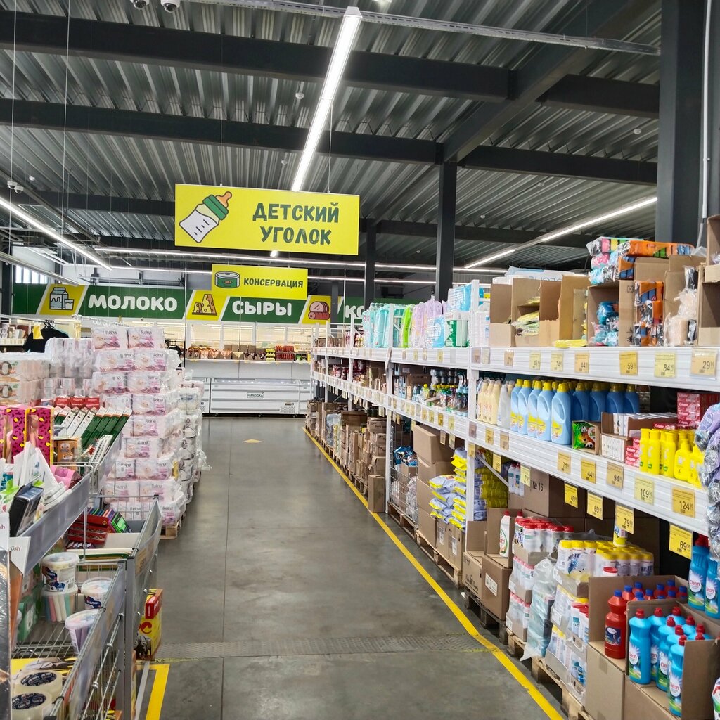Очень нравится мне этот магазин,можно приехать и закупиться в одном месте, не бегать по магазинам.Тут вам и бытовая химия, и консервы,колбасы и сыры,овощи и фрукты,конфеты и печенье, чаи и кофе,и кстати приемлемые цены,а качество не уступает дорогим макетам,удобная парковка,нашей семье нравится, рекомендую, посетите,может и вам будет удобно и интересно.