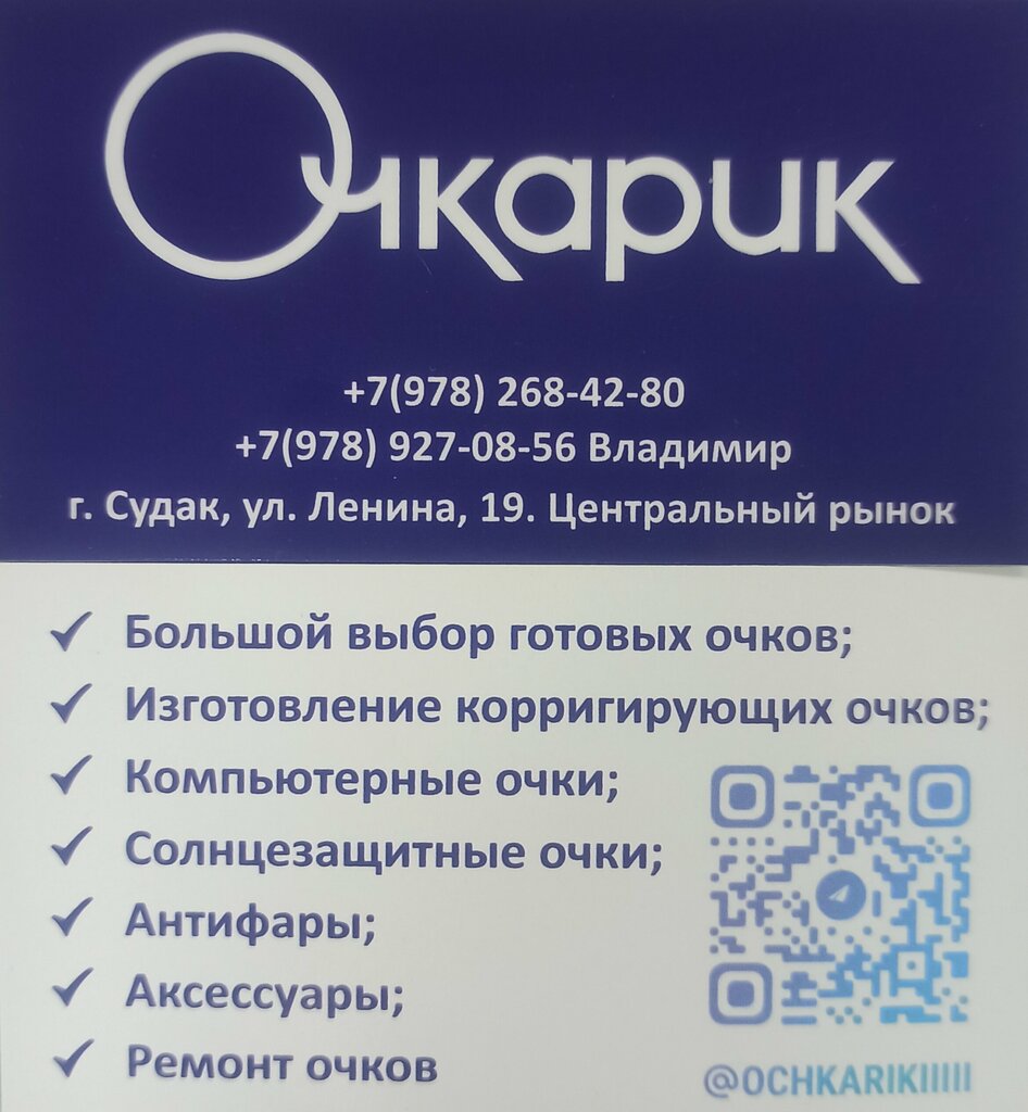Мне кажется, это лучшая оптика в городе! Приехала в Судак по работе, забыла свои солнечные очки дома в Москве. Забежала в «Очкарик» быстренько купить простенькие очки, но даже не ожидала, что будет такой огромный выбор оправ! Зависла на полчаса в магазине. Купила две пары солнечных очков и, думаю, вернусь точно за очками для зрения. Уж очень классный выбор😻 Спасибо большое Владимиру, что помог выбрать классную пару 👓