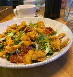 Сегодня впервые побывала в данном заведении - уютное место, впечатление сложилось очень приятное, обязательно вернусь сюда вновь! Пришла в пятничный вечер, когда столы были на бронировании, людей тоже сидело достаточно. Думала взять кофе с собой и десерт, если получится, но отзывчивый персонал сразу подсуетился и посадили меня за стол, до прихода брони. Официант Тимур подошëл сразу же, как только я пролистала меню и выбрала. Такая внимательность не может ни подкупить! Заказывала салат, кофе и десерт. Всë приготовили и принесли быстро. Попробовала новый салат из меню с креветками и муссом из пармезана - хороший, но был бы насыщеннее, если добавить туда помидоры Черри. Меренговый рулет самое то для сладкоежек.