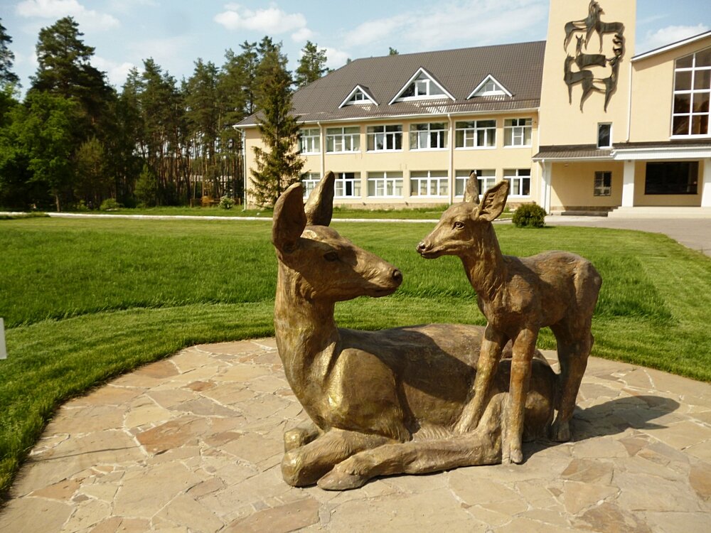 Скульптура оленихи с детенышем - прекрасное украшение перед фасадом главного здания.