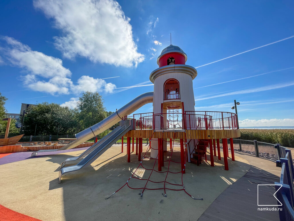 Современная, яркая, интересная детская площадка в военно-морской тематике. Расположена в парке Остров Фортов.