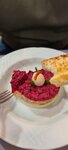 Лепешка из картофельного теста с битыми огурцами, муссом из щавеля и шпината и начинкой на ваш выбор с уральскими рыжиками или слабосоленой форелью, либо с фирменным ростбифом