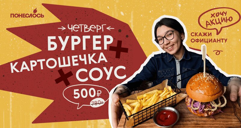 Бургер с картофелем фри и соусом за 490₽ по четвергам