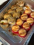 Шампиньоны, авокадо, лук, соус унаги, соус чизу, кунжут, рис, нори