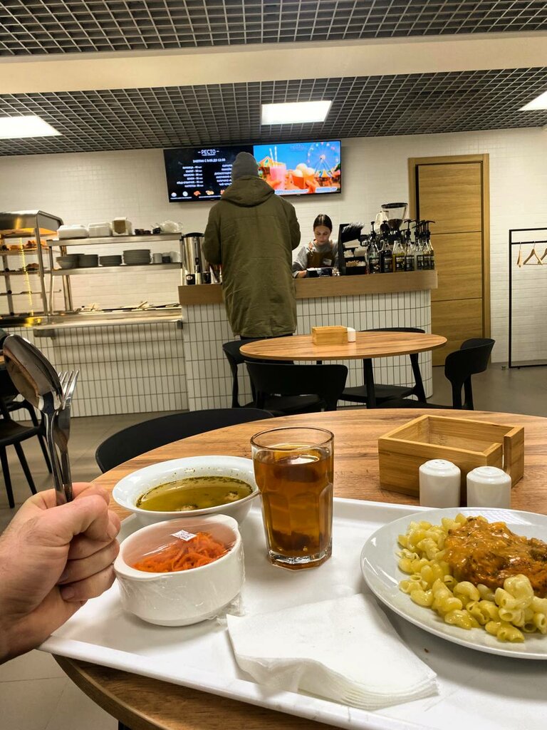 Очень понравилось кафе. Современный стильный интерьер, очень чисто и уютно. Супер приятные цены, вкусная еда и кофе. Обеды до 16.00. Когда мы приехали в 17, уже все было убрано, кроме десертов, но любезный сотрудник предложил нам разогреть любые блюда и это было очень приятно! Спасибо большое за клиентоориентированность. Чудесное место!