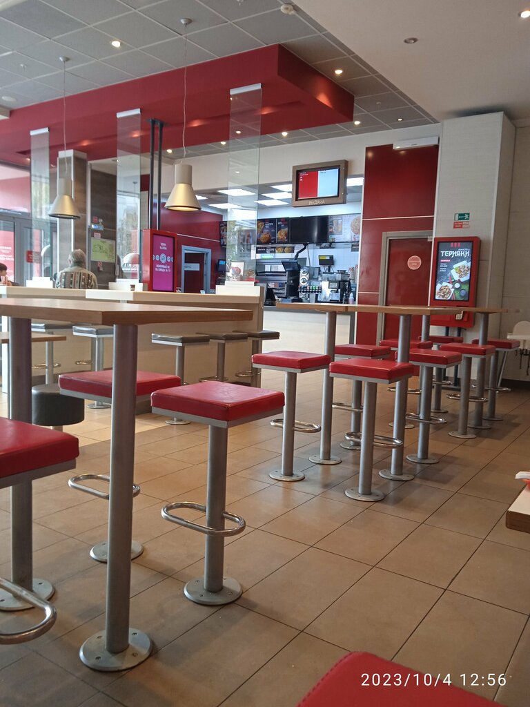 Я пришла к открытию, поэтому людей было мало. Зал чистый и уютный, вкусно пахнет едой. Я брала на самовывоз пунш, дабл чикен, картошку фри и терияки ролл с креветкой. Заказ отдали ровно по времени, все было вкусно. На фото дабл чикен, потому что мне показалось забавно, что такой маленький бургер положили в такую большую коробку В общем, мне все понравилось Забавный факт: моя сестра была САМЫМ первым посетителем данной точки