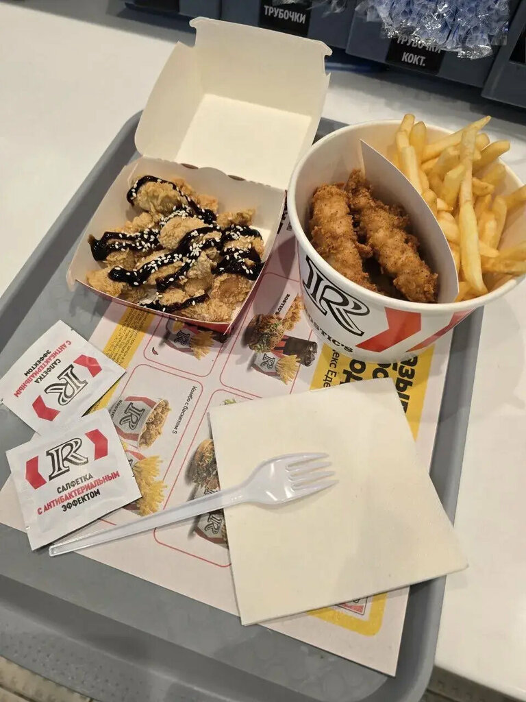 Ну что сказать... "Нормально". Но не факт, что пойдём ещё. Картошка фри никакая (по ощущениям как минимум вчерашняя). Ролл сухой и невкусный. Бургер по словам сына нормальный. Пирожок тоже. В санитарной зоне отсутствует жидкое мыло, хотя мы были утром. Детской зоны нет никакой. Вешалки для одежды мы так и не нашли.