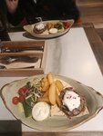 Мясной бифштекс скерт, вырезка говяжья, яйцо, свиной окорок, тортилья пшеничная, огурец, петрушка, красный и репчатый лук, картофельные дольки с кожурой, соус песто, сметана, яйцо пашот