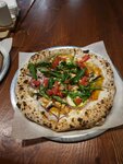 Томатный соус, сыр, рукола, страчателла, помидор, печеный баклажан, печеный перец, острый перец