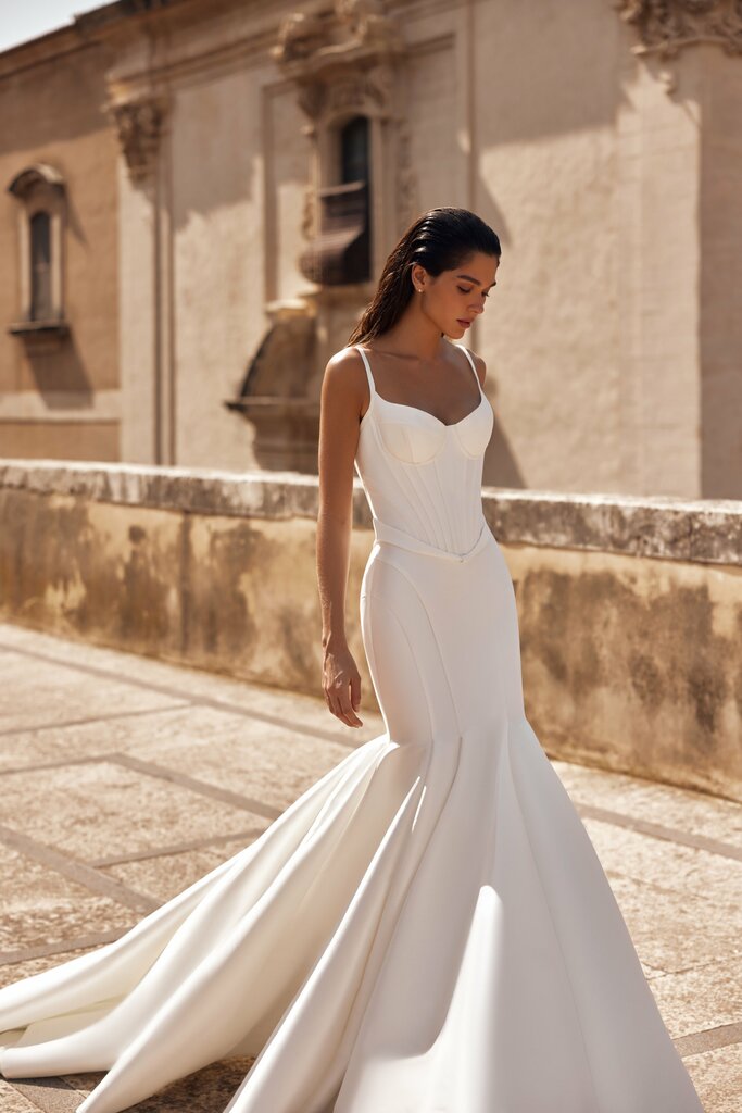 Прямое свадебное платье с акцентным цветком на лифе. Идеальный выбор для утончённого образа. Идеальная посадка подчёркивает фигуру, стильный декор добавляет акцент. В наличии в свадебном салоне Алматы. Ищете свадебные платья в Алматы?