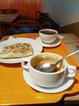 Остановились в доме напротив, зашли изначально по памяти из начала нулевых. Заведение не разочаровало, все как в детстве! Даже зайдя во второй раз сфотографировать блюда не успел - слишком вкусные) Брали по обеду на человека, 470 рублей за вкуснейшие салат, суп, сытный большой блин и морс/чай. По вкусу как у бабушки дома, по атмосфере как в кафешке нулевых, музыка в этом очень помогает. Обязательно зайдем еще!