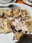 Нежный блин, приготовленный из муки, воды и яйца, наполнен сладкой карамелью и кусочками свежего банана