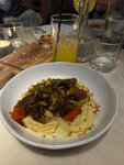 Из Минусов: очень посредственный поке с креветками с отжившей петрушкой + не заявлено в меню, что туда добавляют чили, даже без чили второй раз не взяла бы. Свежевыжатый сок - сок из холодильника, в моменте они его не делают. Принесли уже холодным. Плотная посадка. Из плюсов: локация, атмосфера, обслуживание и самый вкусный сан-себастьян в городе. Подруга брала пастрами, ей понравилось.