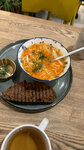 Пряный томатный суп с добавлением сливочного сыра и зеленого масла. Подается с бездрожжевым тартином