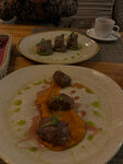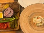 Заказали пять блюд, вот из основного: салат с печенью очень вкусный, но на любителя так как довольно сладкий в связи с добавлением граната и сладкого соуса. Два горячих блюда не разочаровали - мясо высокого качества, морковное пюре вкусное! Отдельная благодарность за оливье - ну очень вкусно !