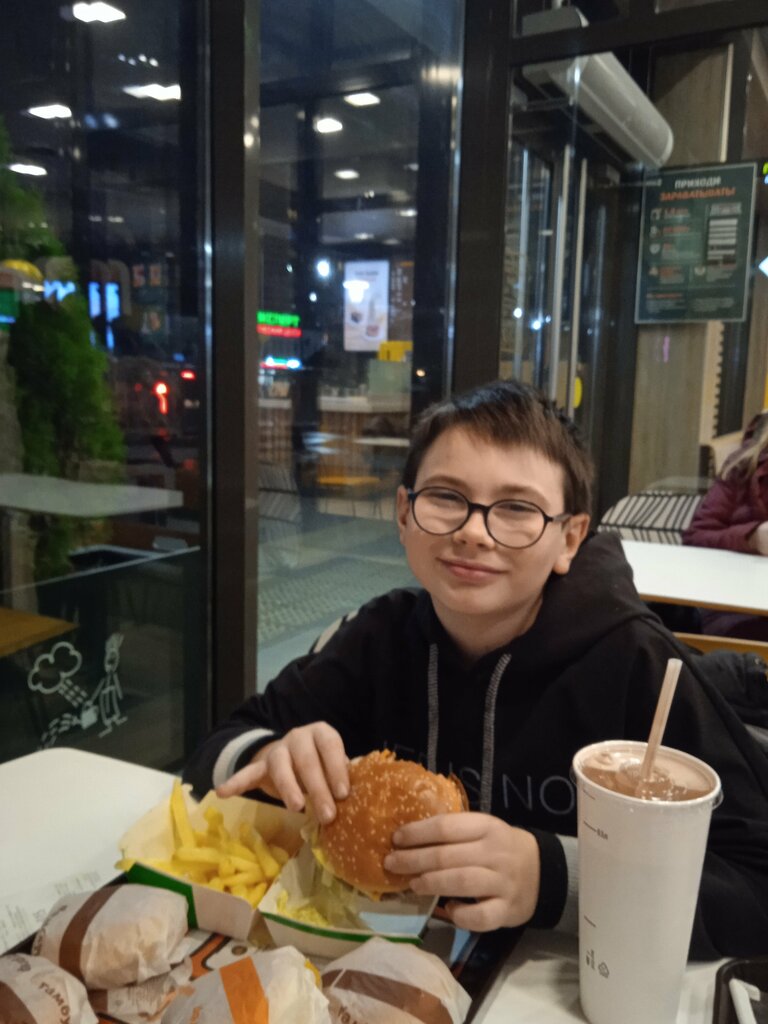 Залетаю сюда иной раз побаловать детей. Не пойму что их тянет на эти булки и картошку. Как мёдом намазано. По вкусу - сами понимаете, мы все люди взрослые. Я лучше кильки в томатном соусе с хлебушком поем, чем вот это вот все. Кто-то говорит мол раньше было лучше. По мне - так одна фигня. Но есть некий вайб, ради которого молодежь здесь трется. В 22 вечера сюда лучше не заходить. Тут Как на вокзале. Идеально - утром. 4 звёзды поставил только из-за места. Днем и утром здесь приятно, светло, чисто и просторно. Можно съесть круасанчик с чизкейком. Все остальное я больше не ем. Просто не хочется. Работникам заведения - респект и уважение.