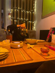 Ходили по купонам , ничего заранее не бронировали. Скидку сделали, быстро посадили, заказали Карри рамен с креветками, соломка из свиных ушек, грибы со спаржей и чай с чабрецом. Все очень вкусно и не дорого. Порции достаточные. Заплатили 1400. Классная идея с вешалками. Музыка приятная , все отлично, советуем